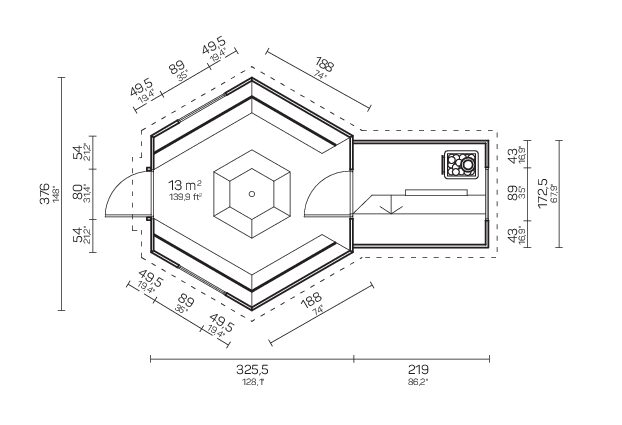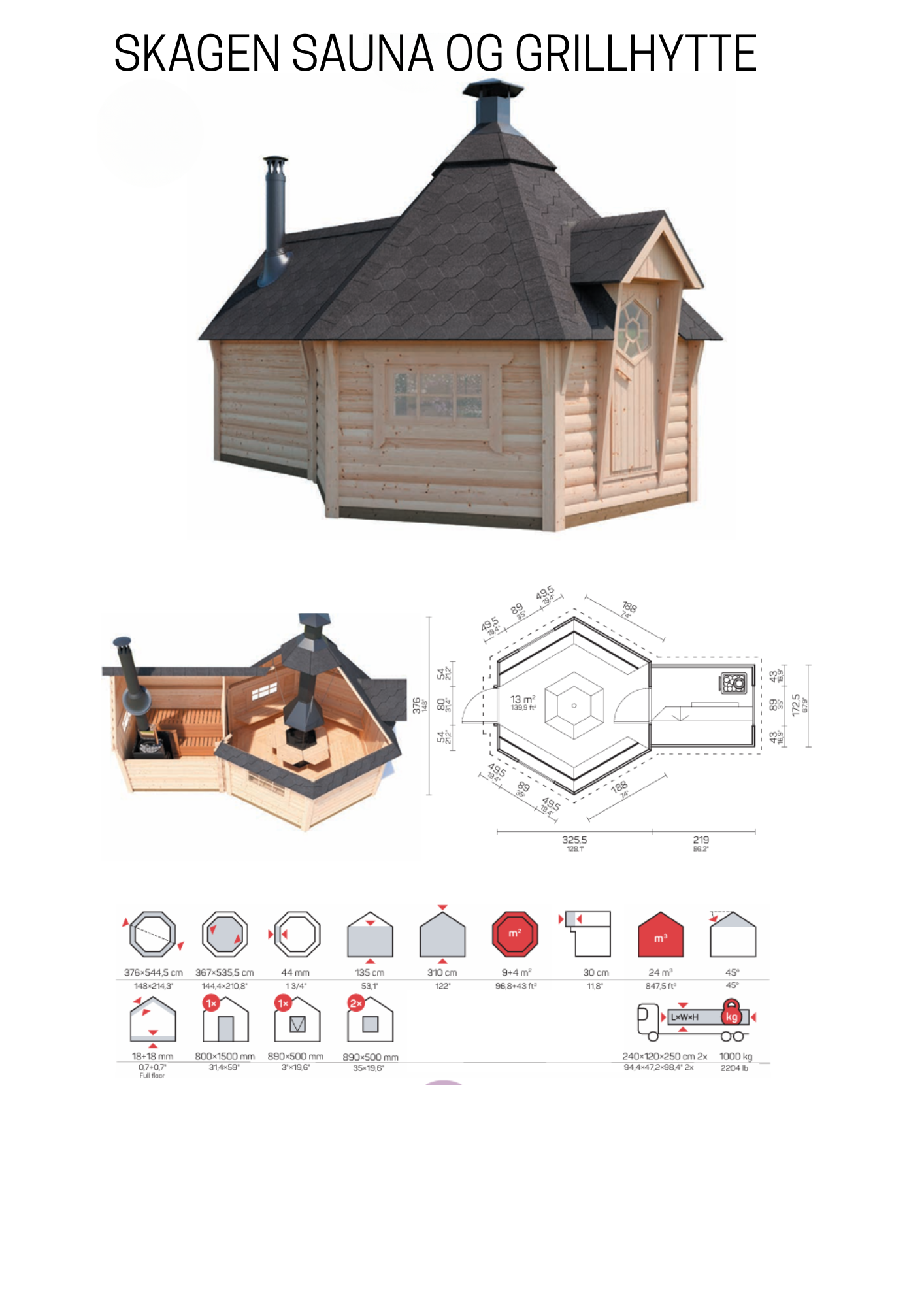 Skagen kombineret Sauna og Grillhytte er en unik 6-kantet grillhytte på 9 m² med en praktisk tilbygget 4-kantet sauna på 4 m². Grillhytten er perfekt til hyggelige stunder med familie og venner, hvor du kan tilberede mad og nyde samværet, mens saunaen giver varme og velvære på kolde dage.