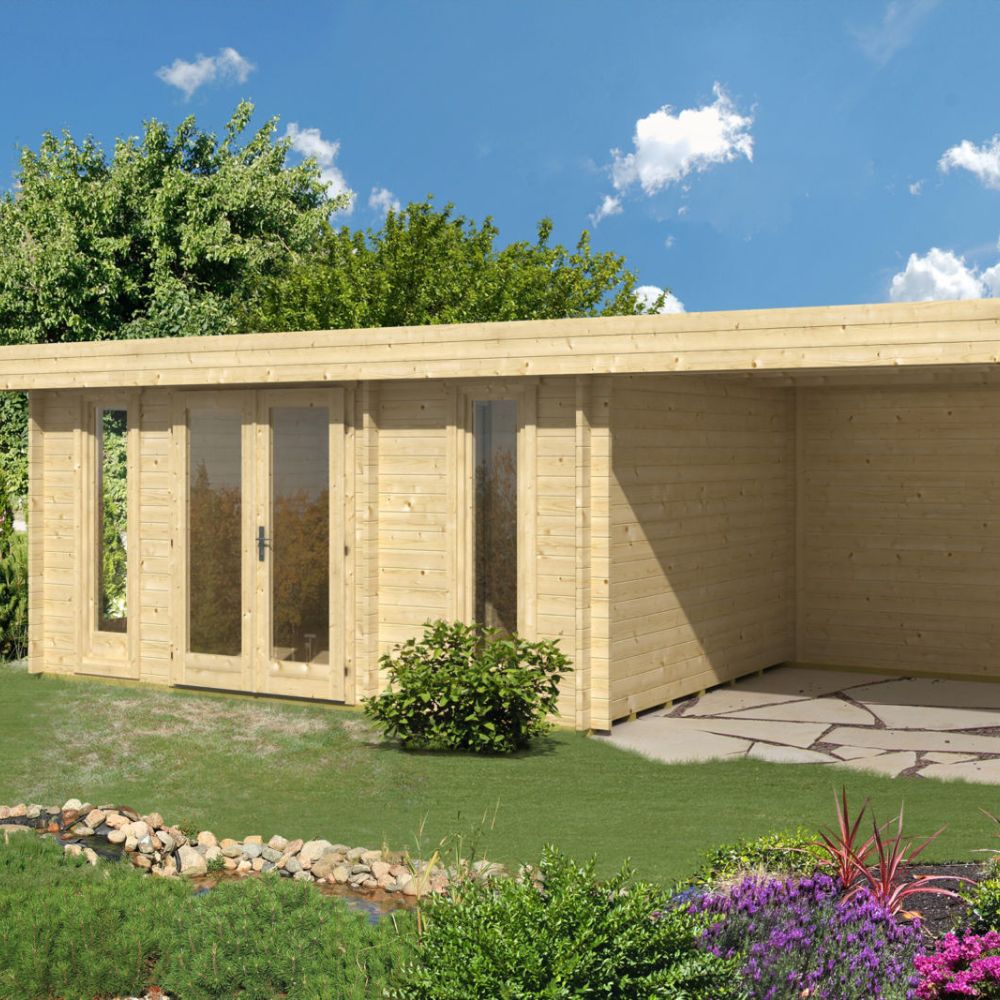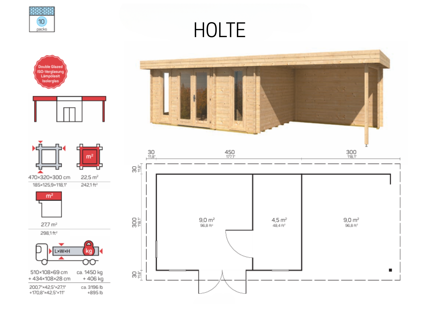 Huset har en dobbeltdør og en overdækket terrasse på 9 m², perfekt til udeliv og afslapning året rundt. Hytten leveres i ubehandlet træ, så du selv kan vælge farve og finish og sætte dit personlige præg. Holte Havehus kombinerer praktisk funktionalitet med et klassisk udtryk, der passer ind i de fleste haver.