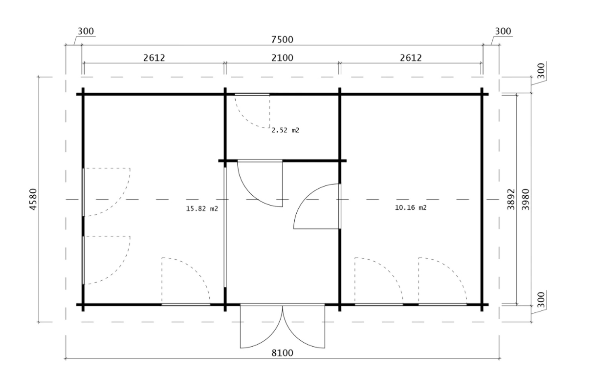 • Dør: 1580 x 2040 mm + 840 x 1965 mm - indvendige døre