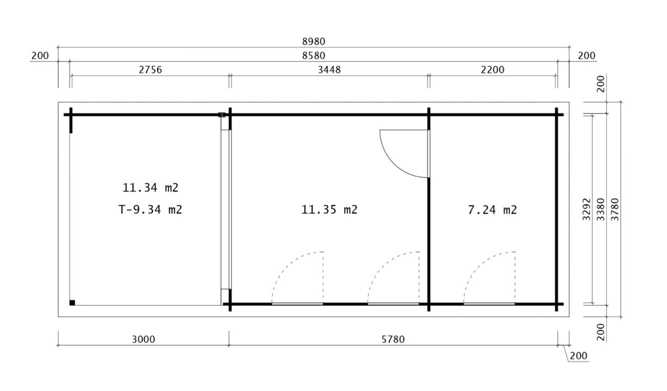• Dør: 2800 x 1975 mm + 840 x 1965 mm