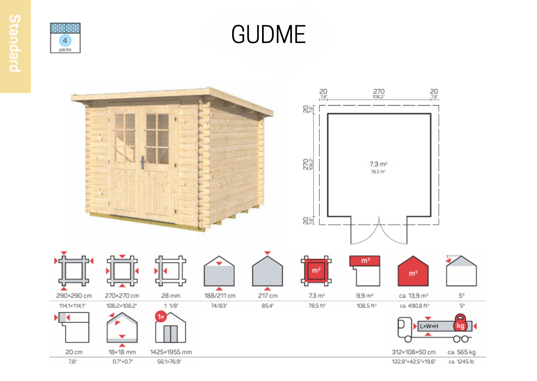 Gudme Havehus er et simpelt og funktionelt havehus på 7,3 m² med et let skråt tag, der sørger for, at regnvandet løber af, uden at huset får en høj tagprofil. Den kompakte størrelse gør det nemt at placere i haven, samtidig med at det giver et hyggeligt opholdsrum til afslapning, hobby eller opbevaring.