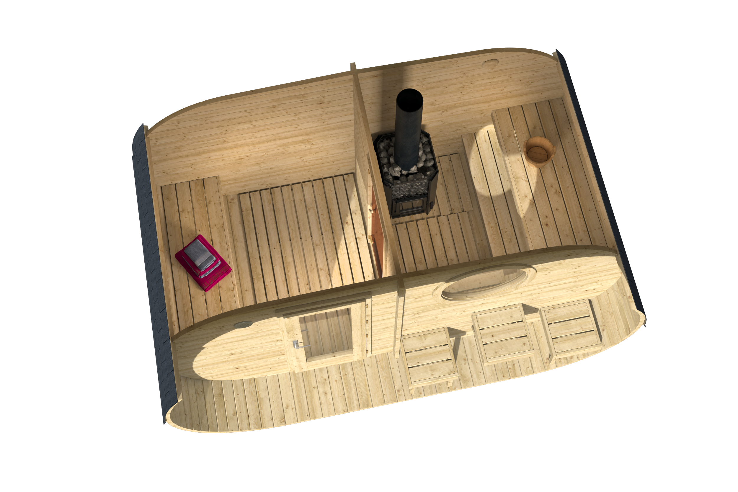 Borbjerg Saunahytte er en unik oval sauna med plads til 6 personer. Den har et separat omklædningsrum, så du kan skifte og gøre dig klar i fred og ro, mens saunaen kan nydes uforstyrret. Den ovale form skaber en hyggelig og intim atmosfære, hvor varme og velvære er i fokus.