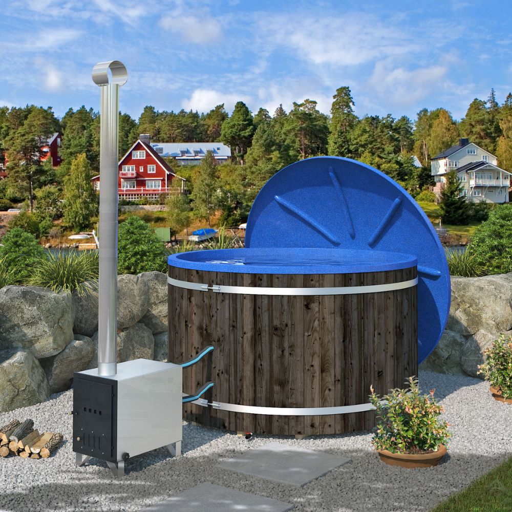 Gudhjem Vildmarksbad er et smukt, klassisk træbad med plads til afslapning og wellness. Det har en blå foring og et matchende blåt låg, som giver et frisk og indbydende udtryk. Vildmarksbadet er udstyret med en ovn, der hurtigt varmer vandet op, så du kan nyde et varmt bad selv på kolde dage.