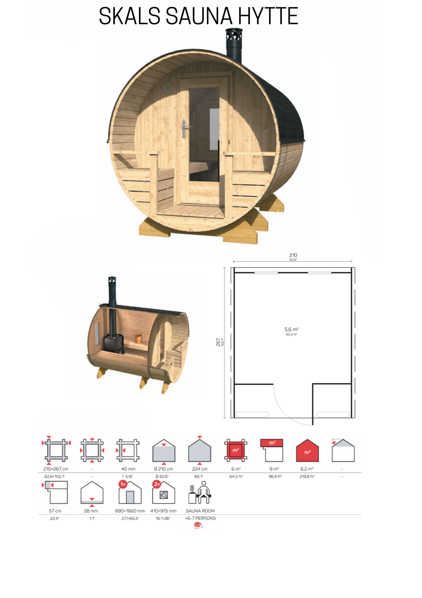Skals Saunahytte er en rund sauna med plads til 6-7 personer. Indenfor er der faste bænke langs væggene, og udenfor fortsætter den runde form med en overdækket siddeplads, hvor du kan nyde haven i læ og hygge året rundt.