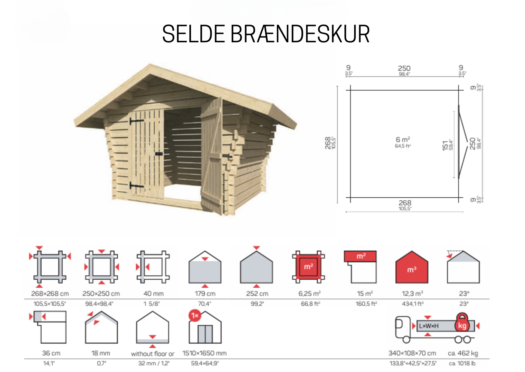 Selde Brændeskur på 6 m² er et lille og funktionelt skur, perfekt til opbevaring af brænde, haveredskaber eller andet udstyr. Den brede dobbeltdør i fronten gør det nemt at læsse ind og ud, så arbejdet i haven bliver lettere.