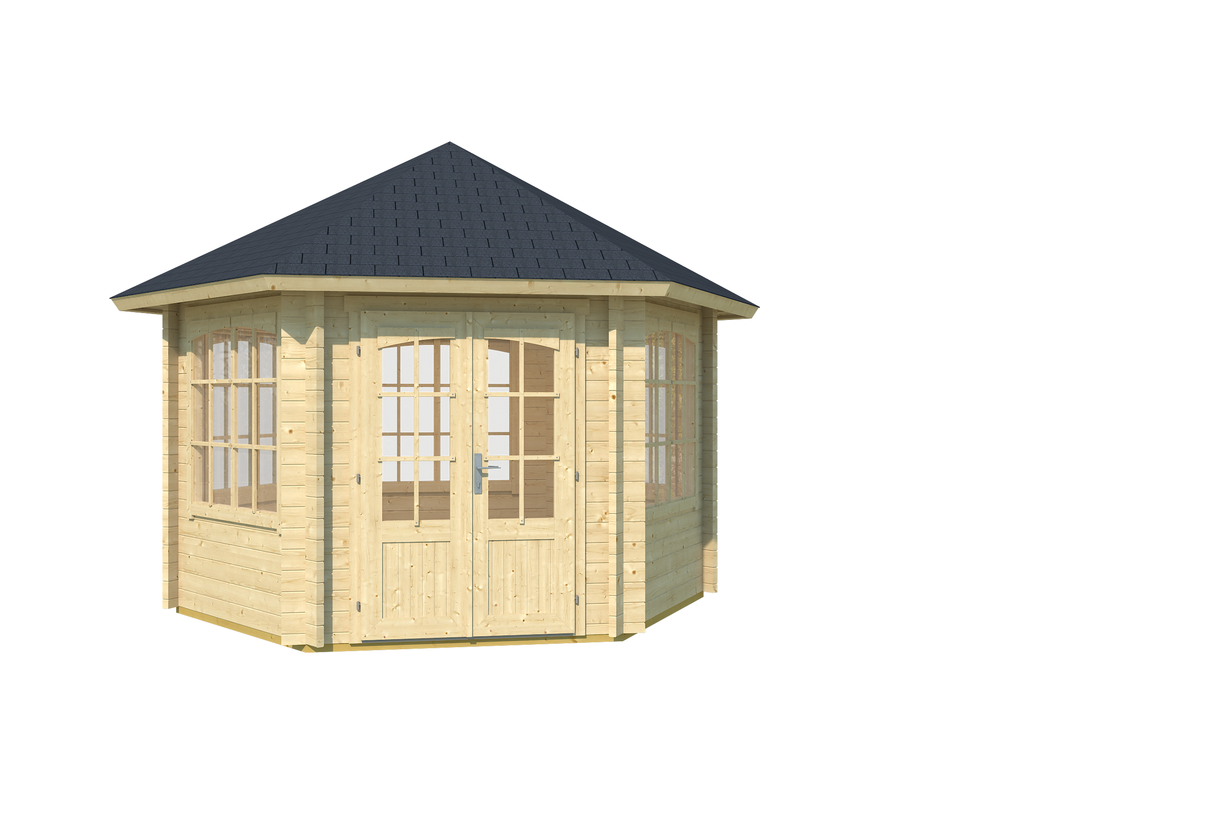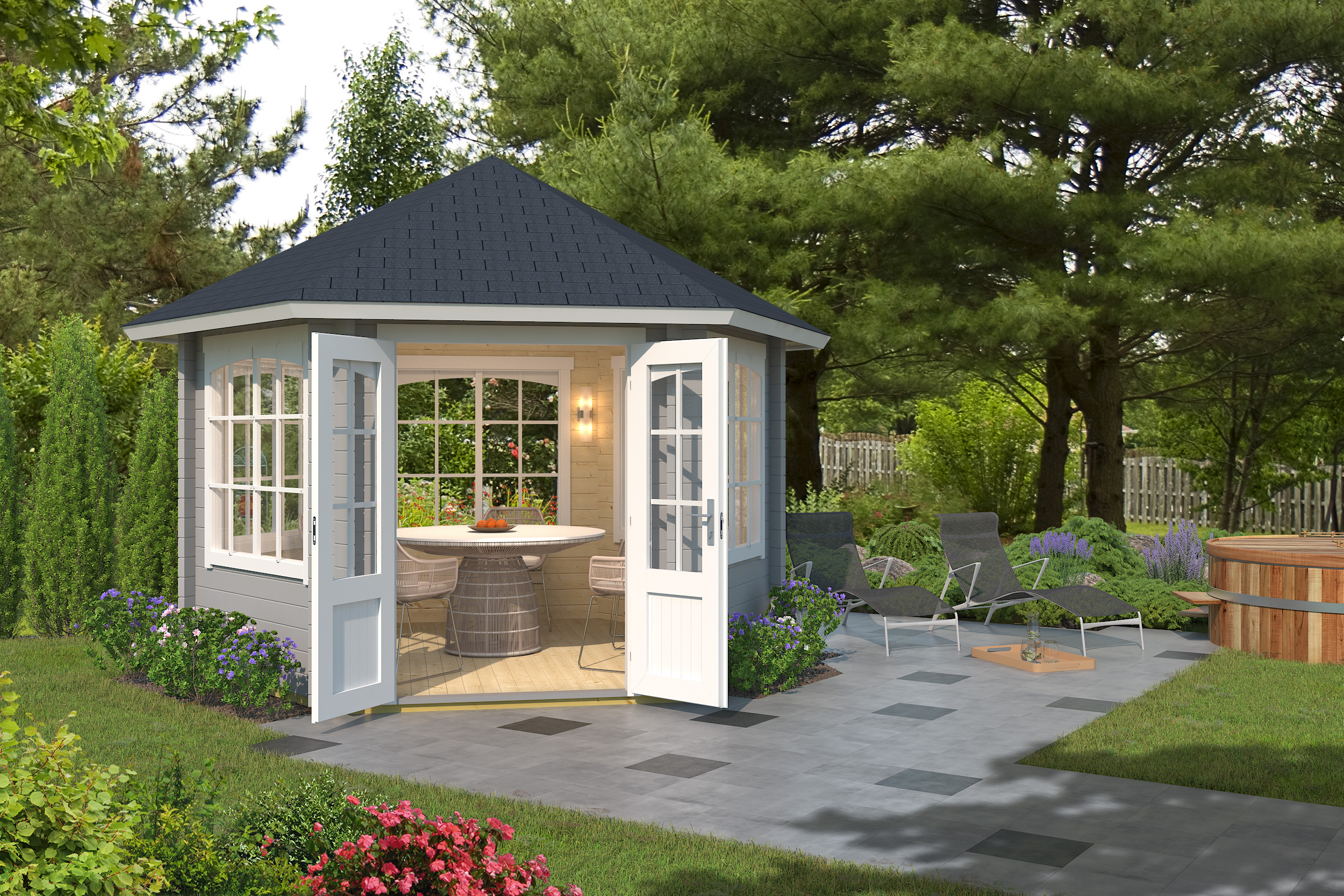 Hasselager Pavillon er en smuk og rummelig 6-kantet pavillon på 10,04 m² med en imponerende kiphøjde på 306 cm, som giver en fantastisk rumfornemmelse. Den høje loftshøjde skaber et åbent og luftigt miljø, hvor der er plads til både hygge og samvær.